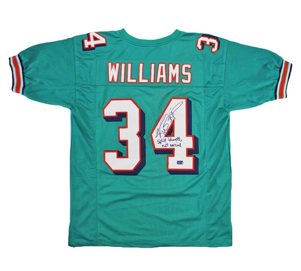 A Miami Custom Teal Jersey hand signed by Ricky Williams. The item and signature are in excellent condition. In addition to signing his name, Ricky also inscribed "Split Blunts Not Carries" on the item. Ricky is a former American football running back who played 11 seasons in the NFL. Ricky played college football for the University of Texas, where he was a two-time All-American and won the Heisman Trophy. Ricky was drafted by the New Orleans Saints before being traded to the Miami Dolphins. He also spent a season with the Baltimore Ravens. AUTHENTICATION: Your item is tagged with a Ricky Williams Exclusive SmarTag powered by Prova Technology, which gives you digital access to your items authentication records, which include a proof picture from the signing.