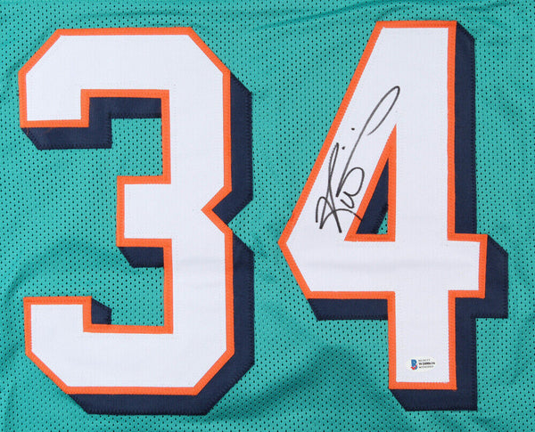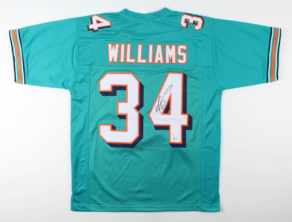 Custom on-field style jersey. Everything is sewn on, size XL. Hand-signed by Ricky Williams. The lot / autograph(s) includes an official Beckett Authentication Services serially-numbered hologram for authenticity purposes. The signing of this item was witnessed by Beckett.Authentication: Beckett Hologram
