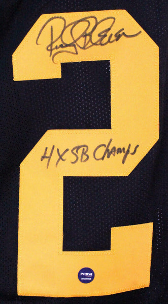 Rocky Bleier Autographed Black/Yellow # Pro Style Jersey w/ 4x SB Champs-Prova *Black THIS IS NOT AN NFL JERSEY. THIS HAS NO TAGS, NO LOGOS, NO EMBLEMS. This is a hand autographed Jersey of Rocky Bleier. This is Custom Made (non name brand) Authentic Style (stitched letters and numbers). Inscribed 4x SB Champs. This item has a Prova Protection Authentication, which comes with a Prova numbered sticker. You can view this item on the Prova website and it shows when and where the item was signed. It was signed either at a public autograph appearance or a private signing. This is a stock photo of the item. Although you may not receive this exact item, the item you receive is virtually identical and brand new in great shape. Jersey size is XL.