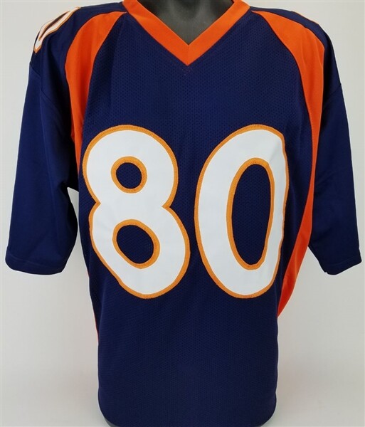 This Custom on-field style adult XL autographed jersey has been personally hand-signed by Rod Smith of the Denver Broncos. Smith added the inscription "2x SB Champs" along with his signature.This autograph is certified by James Spence Authentication's (JSA) Witnessed Protection Program. That means that a JSA representative was present when this item was signed. It comes with the numbered hologram and matching Certificate of Authenticity. Custom on-field style jerseys are a more affordable option for autograph seekers. These jerseys do not have any brand name or tags and are made in the Philippines. They feature stitched on names and numbers and are made to look very similar to the on-field jerseys that the players wear. These custom jerseys are very commonly used in the memorabilia industry.
