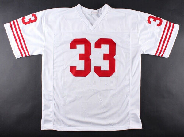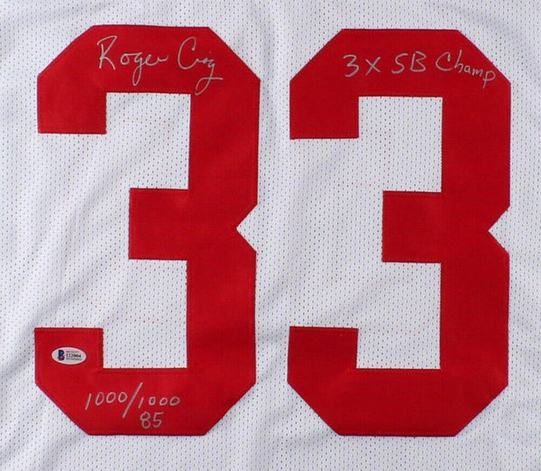 Custom on-field style jersey. Everything is sewn on, size XL. Hand-signed in silver paint pen by Roger Craig.The lot includes an official Beckett hologram and matching COA for authenticity purposes. The signing of this item was witnessed by Beckett.Authentication: Beckett COA