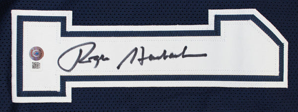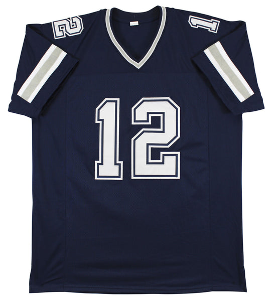 This Autographed Navy Blue Pro Style Jersey has been Personally Signed by Roger Staubach of the Dallas Cowboys. This item is 100% Authentic to include a hologram by Beckett Authentication Services. This item will come with an affixed Beckett Authentication Services (BAS) authentication sticker, which includes a scannable QR code to verify authenticity. Please note that Beckett no longer provides serial-numbered COA cards, and the attached BAS sticker will serve as the complete authentication for this item. This is a BAS Witnessed Protection Program item which means a Beckett Authentication Service representative was present when this item was being signed. We conducted an autograph signing with Roger Staubach where multiples of the same item were signed. While the photographs are representative of this item, the size, placement and strength of the signature may vary. Each item is hand signed, therefore, each autograph is unique. This item can be verified through BAS Witnessed. This is a X-Large sized Jersey.