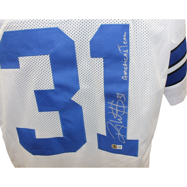 The number in the listing title is just an inventory sku for our records and is not the authentication number. The item pictured is a stock photo unless otherwise noted. This is a Pro Style white jersey that was personally autographed by Roy Williams with inscription "America's Team". Includes a certificate of authenticity from Beckett Authentication Services (BAS) and Denver Autographs.FREE SHIPPING within the USA on orders over $10!
