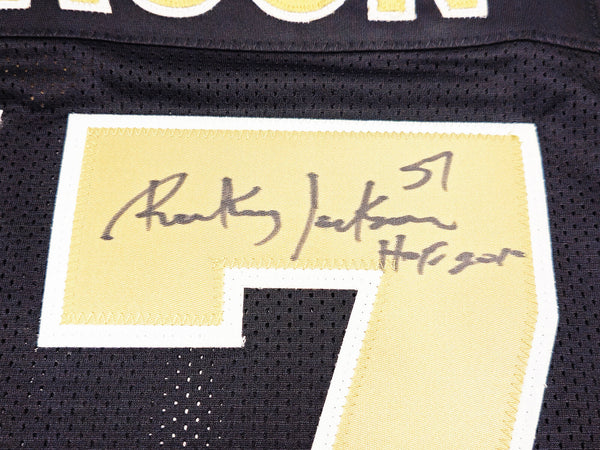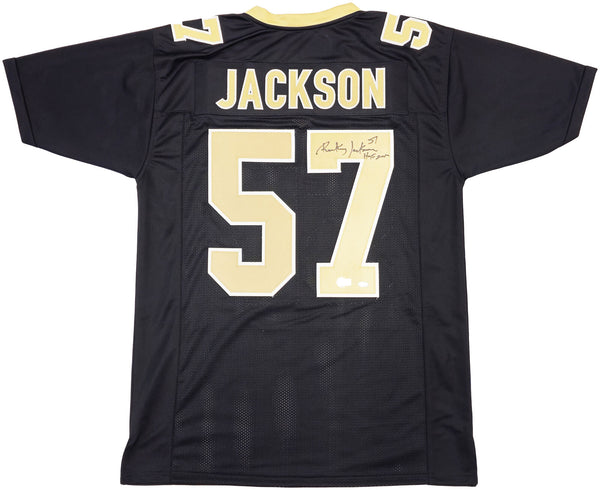 This is a Black Jersey that has been hand signed by Rickey Jackson. This is a custom jersey with no name brand. The approximate size is XL. It has nice sewn in name and numbers. This item was inscribed "HOF 2010." This item has been certified authentic by Beckett Authentication (BAS) and comes with their tamper-proof QR Code sticker that can be verified on beckett-authentication.com.
