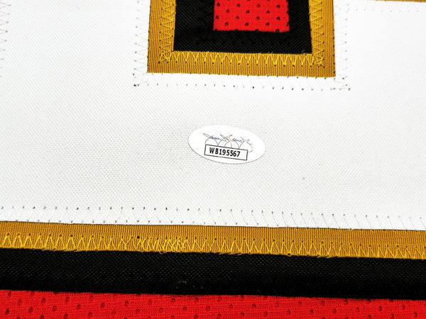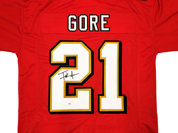 This is a Red Jersey that has been hand signed by Frank Gore. This is a custom jersey with no name brand. The approximate size is XL. It has nice sewn in name and numbers. This item has been certified authentic by JSA and comes with their tamper-proof sticker BUT IS MISSING the matching certificate of authenticity.