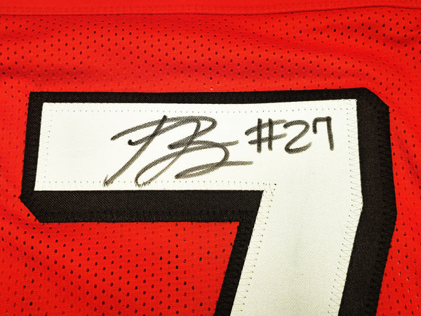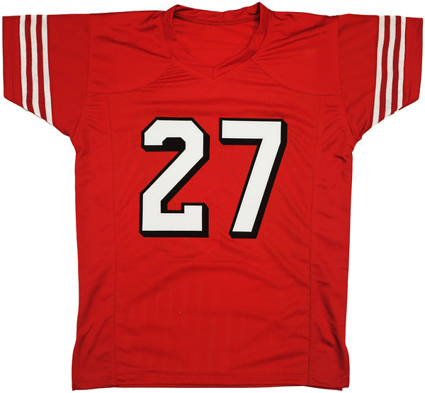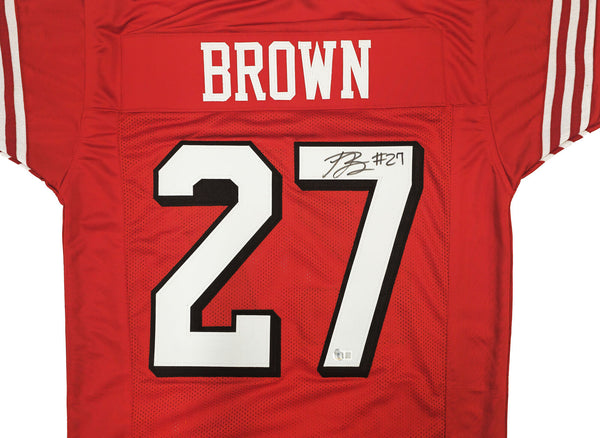 This is a Red Jersey that has been hand signed by Ji'Ayir Brown. This is a custom jersey with no name brand. The approximate size is XL. It has nice sewn in name and numbers. This item has been witnessed and certified authentic by Beckett Authentication (BAS) and comes with their tamper-proof witness sticker.