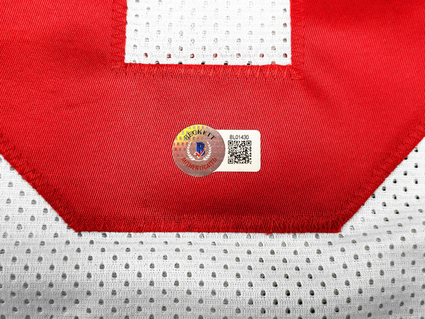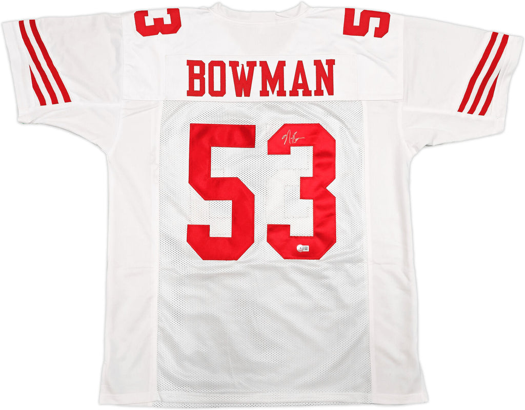 This is a White Jersey that has been hand signed by NaVorro Bowman. This is a custom jersey with no name brand. The approximate size is XL. It has nice sewn in name and numbers. This item has been certified authentic by Beckett Authentication (BAS) and comes with their tamper-proof hologram.