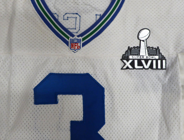 This is a White Wilson Proline Seattle Seahawks Jersey that has been hand signed by Russell Wilson. This jersey is Size 44. This item has the official tamper-proof Russell Wilson hologram and matching certificate of authenticity. NOTE: This is an Authentic Wilson jersey that was customized with the Wilson nameplate and numbers. It has has the SB XLVIII Patch sewn on.