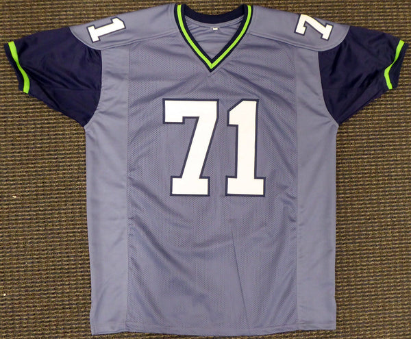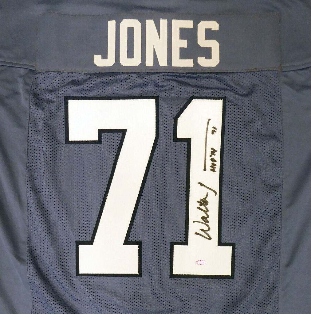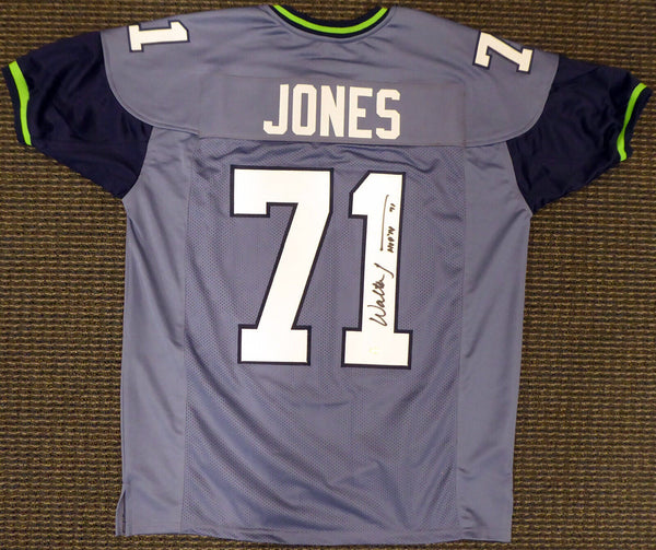 This is a Blue Custom Jersey that has been hand signed by Walter Jones. This is a custom jersey with no name brand. The approximate size is XL. It has nice sewn in name and numbers. Along with the autograph, this item also comes with the inscription which reads "HOF '14". This item was signed in the presence of a Mill Creek Sports representative and comes with their serial numbered hologram and matching certificate of authenticity.