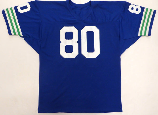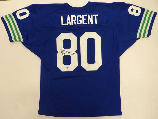 This is a Blue Jersey that has been hand signed by Steve Largent. This is a custom jersey with no name brand. The approximate size is XL. It has nice sewn in name and numbers. This item was inscribed "HOF 95." This item was signed in the presence of a Mill Creek Sports representative and comes with their serial numbered hologram and matching certificate of authenticity.