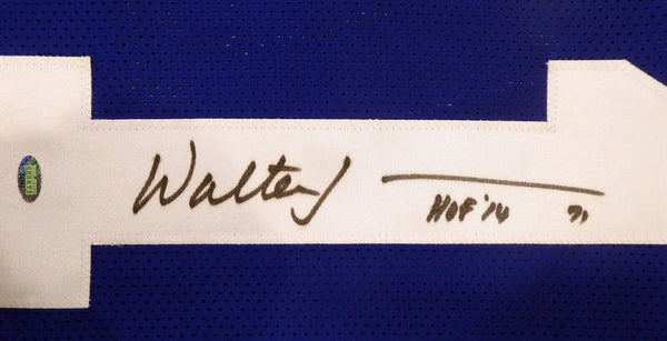 This is a Blue Custom Jersey that has been hand signed by Walter Jones. This is a custom jersey with no name brand. The approximate size is XL. It has nice sewn in name and numbers. Along with the autograph, this item also comes with the inscription which reads "HOF '14". This item was signed in the presence of a Mill Creek Sports representative and comes with their serial numbered hologram and matching certificate of authenticity.