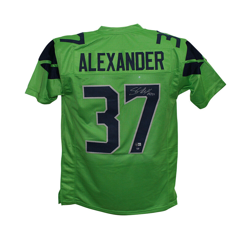 Shaun Alexander Autographed/Signed Pro Style Green XL Jersey Beckett 35497 The number in the listing title is just an inventory sku for our records and is not the authentication number. The item pictured is a stock photo unless otherwise noted. This is a custom pro style green XL jersey with sewn on name and numbers that was personally autographed by Shaun Alexander. Includes a certificate of authenticity from Beckett Authentication Services (BAS) and Denver Autographs.