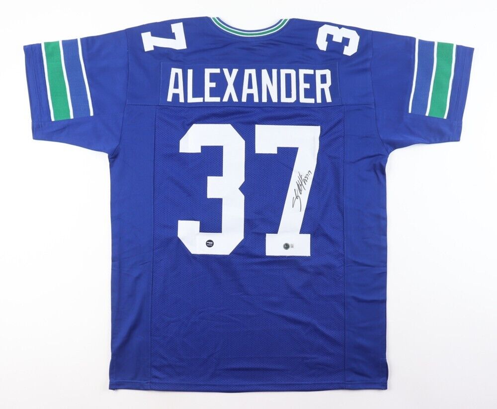 Custom on-field style jersey. Everything is sewn on, size XL. Hand-signed by Shaun Alexander. Please note, there is damage on the reverse number. Please see photos in regarding the condition of the item.The autograph includes an official Beckett Authentication Services serially numbered hologram and QR Code Card for authenticity purposes. The signing of this item was witnessed by Beckett.Authentication: Beckett Hologram with QR Code cardCustom on-field style jerseys are a more affordable option for autograph seekers. These jerseys do not have any brand name or tags and are made in the Philippines. They feature stitched on names and numbers and are made to look very similar to the on-field jerseys that the players wear. These custom jerseys are very commonly used in the memorabilia industry.