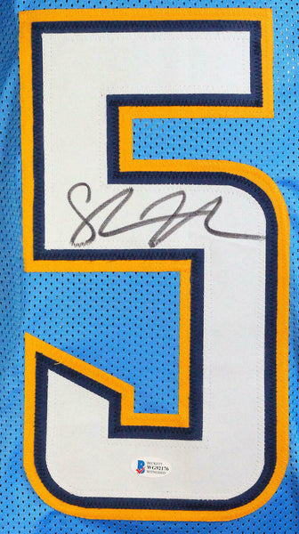 Shawne Merriman Autographed Lt. Blue Pro Style Jersey - Beckett W Auth THIS IS NOT AN NFL JERSEY. THIS HAS NO TAGS, NO LOGOS, NO EMBLEMS. This is a hand autograph of Shawne Merriman on a Custom Made (non name brand) Authentic Style (stitched letters and numbers) Jersey. This item has a Beckett Witnessed Authentication, which comes with a numbered and a matching Beckett Certificate of Authenticity. You can view this item on the Beckett Authentication website. It was signed either at a public autograph appearance or a private signing. This is a stock photo of the item. Although you may not receive this exact item, the item you receive is virtually identical and brand new in great shape. Jersey size is XL.