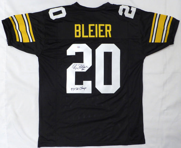 This is a Black Jersey that has been hand signed by Rocky Bleier. This is a custom jersey with no name brand. The approximate size is XL. It has nice sewn in name and numbers. This item was inscribed "4X SB Champ." It has been certified authentic by PSA/DNA and comes with their sticker and matching certificate of authenticity.