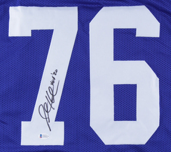 Custom on-field style jersey. Everything is sewn on, size XL. Has been hand-signed by Steve Hutchinson (HOF).The lot / autograph(s) includes an official Beckett Authentication Services serially-numbered hologram and matching QR code card for authenticity purposes. The signing of this item was witnessed by Beckett.Authentication: Beckett QR Code Card