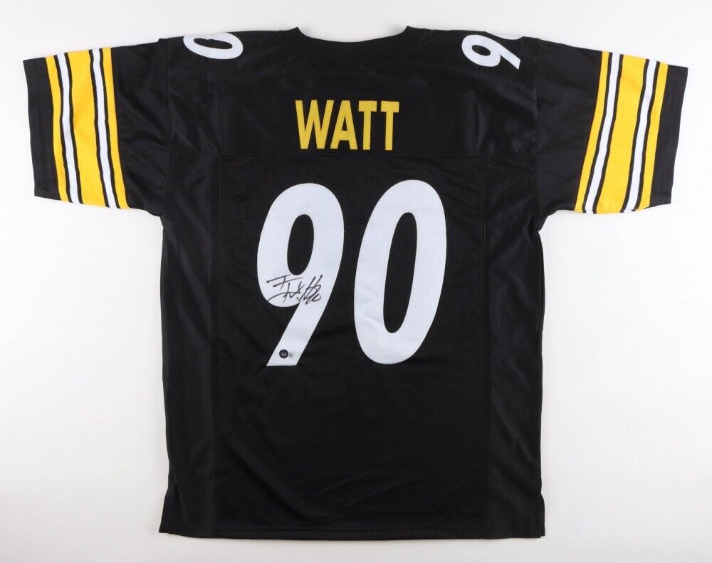 Custom on-field style jersey. Everything sewn on, size XL. Has been hand-signed by T. J. Watt.The lot / autograph(s) includes an official Beckett Authentication Services serially numbered hologram and QR Code card for authenticity purposes. The signing of this item was witnessed by Beckett.Authentication: Beckett Hologram with QR Code card