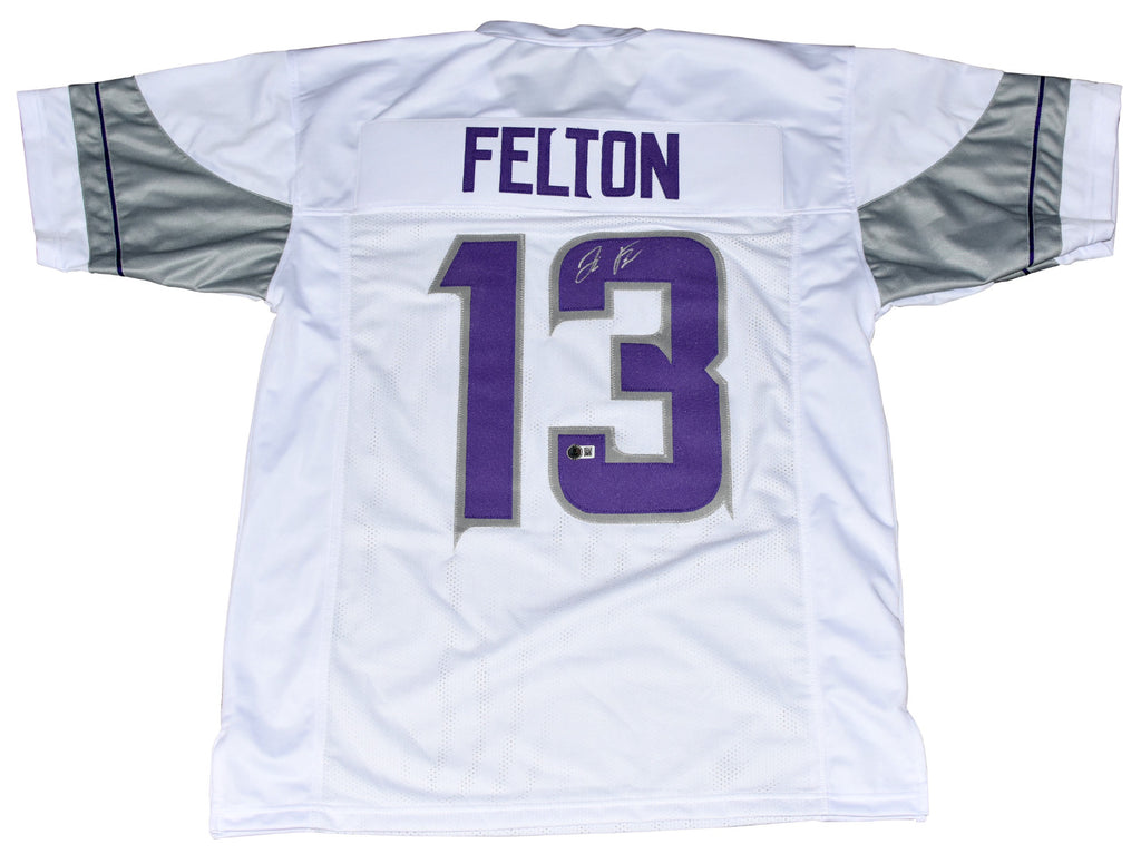 Tai Felton, star wide receiver for the Minnesota Vikings, has hand signed this white custom jersey at a private signing. Jersey is size XL and all letters/numbers are sewn-on. This item is authenticated by Beckett Authentication Services and was signed in the presence of one of their representatives. Their tamper-evident hologram featuring a QR code and serial number is on the item. The authenticity can be verified online by entering the serial number or scanning the QR code.Item pictured may not be the exact item you will receive. It will be similar quality, and we guarantee your satisfaction.