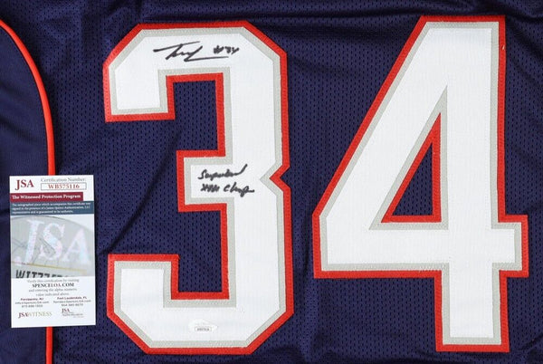 Custom on-field style jersey with everything sewn on, size XL. Jersey has been hand-signed in black felt-tip pen by Tebucky Jones of the New England Patriots.The autograph(s) includes an official James Spence Authentication (JSA) hologram and matching COA for authenticity purposes. The signing of this item was witnessed by JSA.Authentication: JSA COACustom on-field style jerseys are a more affordable option for autograph seekers. These jerseys do not have any brand name or tags and are made in the Philippines. They feature stitched on names and numbers and are made to look very similar to the on-field jerseys that the players wear. These custom jerseys are very commonly used in the memorabilia industry.