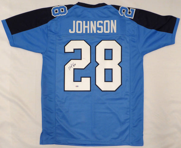 This is a Blue Jersey that has been hand signed by Chris Johnson. This is a custom jersey with no name brand. The approximate size is XL. It has nice sewn in name and numbers. Note: There is a pen mark by the autograph, as shown in the pictures. This item has been certified authentic by PSA/DNA and comes with their tamper-proof sticker and matching certificate of authenticity.