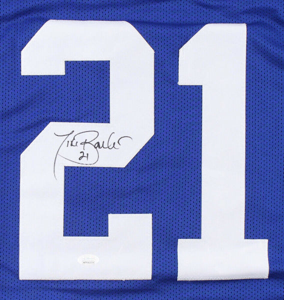 This autographed jersey has been personally hand-signed by Tiki Barber of the New York Giants.This autograph is certified by James Spence Authentication's (JSA) Witnessed Protection Program. That means that a JSA representative was present when this item was signed. It comes with the numbered hologram and matching Certificate of Authenticity.