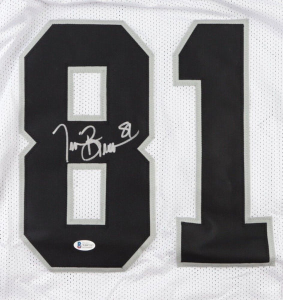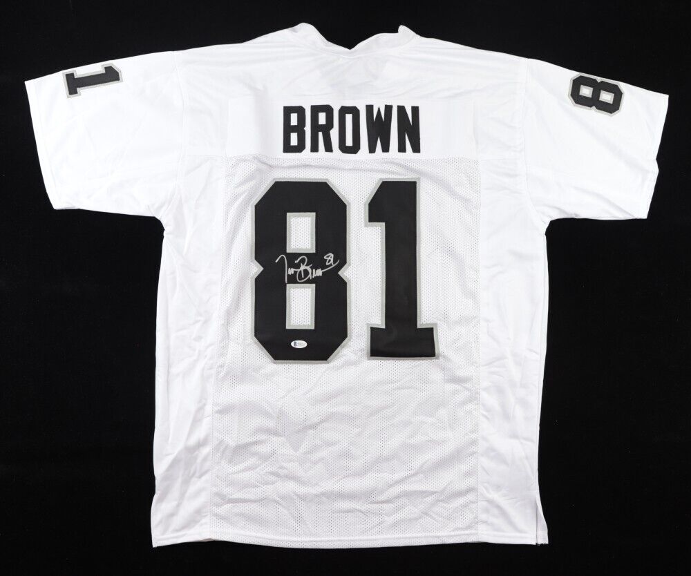 This autographed adult XL jersey has been personally hand-signed by Tim Brown of the Oakland Raiders.The autograph includes an official Beckett Authentication Services serially-numbered hologram and matching COA for authenticity purposes. The signing of this item was witnessed by Beckett.Authentication: Beckett COACustom on-field style jerseys are a more affordable option for autograph seekers. These jerseys do not have any brand name or tags and are made in the Philippines. They feature stitched on names and numbers and are made to look very similar to the on-field jerseys that the players wear. These custom jerseys are very commonly used in the memorabilia industry.