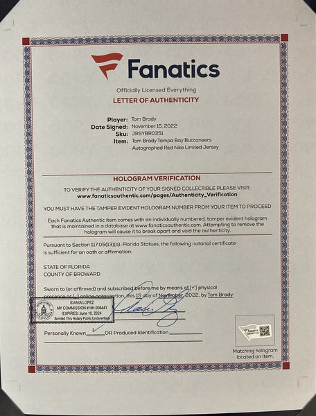 Featured is a Tom Brady signed Tampa Bay Buccaneers Limited football jersey. This jersey has been hand signed by Brady and comes with the Fanatics hologram and certificate of authenticity. This jersey is size L. This jersey would make a great addition to any sports memorabilia collection!. SPECIFICATIONS Autographed By: Tom Brady Team: Tampa Bay Buccaneers Sport: Football Authentication: Fanatics Authentic