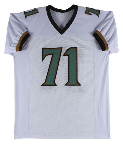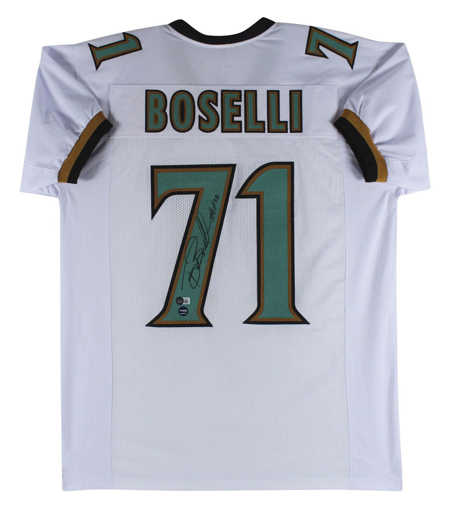 This Autographed White Pro Style Jersey with the inscription of "HOF 22" has been Personally Signed by Tony Boselli of the Jacksonville Jaguars. This item is 100% Authentic to include a hologram by Beckett Authentication Services. This item may come with the new Beckett Authentication hologram that has a scannable QR code rather than the traditional COA. If you would like to have a COA, you are welcome to reach out to Beckett for a printed certification once you receive your item. This is a BAS Witnessed Protection Program item which means a Beckett Authentication Service representative was present when this item was being signed. We conducted an autograph signing with Tony Boselli where multiples of the same item were signed. While the photographs are representative of this item, the size, placement and strength of the signature may vary. Each item is hand signed, therefore, each autograph is unique. This item can be verified through BAS Witnessed. This is a X-Large sized, non-branded, custom-stitched Jersey.