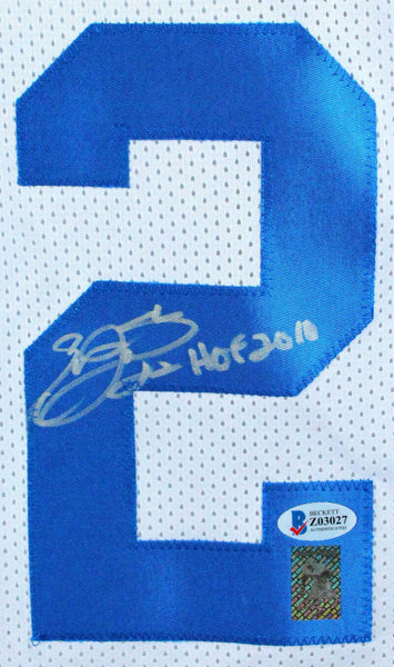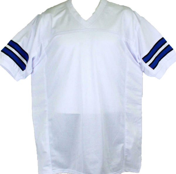 Triplets Aikman Irvin Smith Autographed White Pro Style Jersey- Beckett W Auth THIS IS NOT AN NFL JERSEY. THIS HAS NO TAGS, NO LOGOS, NO EMBLEMS. This is a Hand Autographed Jersey of Troy Aikman, Michael Irvin and Emmitt Smith. This is a Custom Made (Non Name Brand) Authentic Style (Stitched Letters and Numbers). This item has a Beckett Witness Authentication, which comes with a #'ed Hologram. You can view this item on the Beckett website, it shows when and where the item was signed. It was signed either at a public autograph appearance or a Private Signing. This is a stock photo of the item. Although you may not receive this exact item, the item you receive is virtually identical and brand new in great shape. Jersey size is XL.