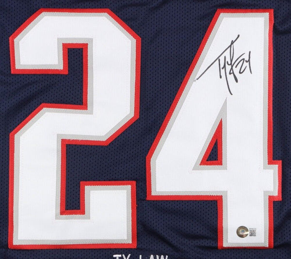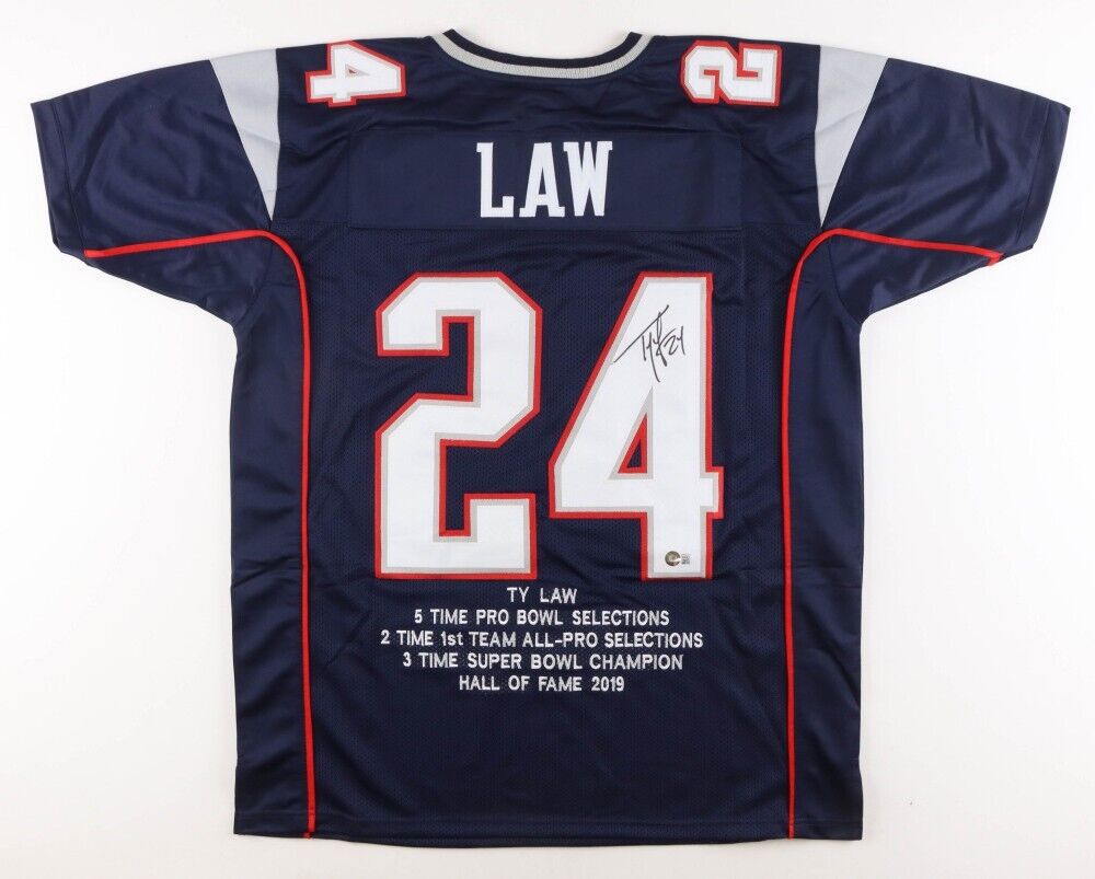 Custom on-field style, everything is sewn on, size adult XL. Hand-signed by Ty Law (HOF). Law's career highlights have been custom stitched into the back of the jersey below the reverse numbers.The lot / autograph(s) includes an official Beckett Authentication Services serially-numbered hologram for authenticity purposes. The signing of this item was witnessed by Beckett.Authentication: Beckett Hologram