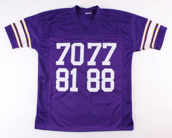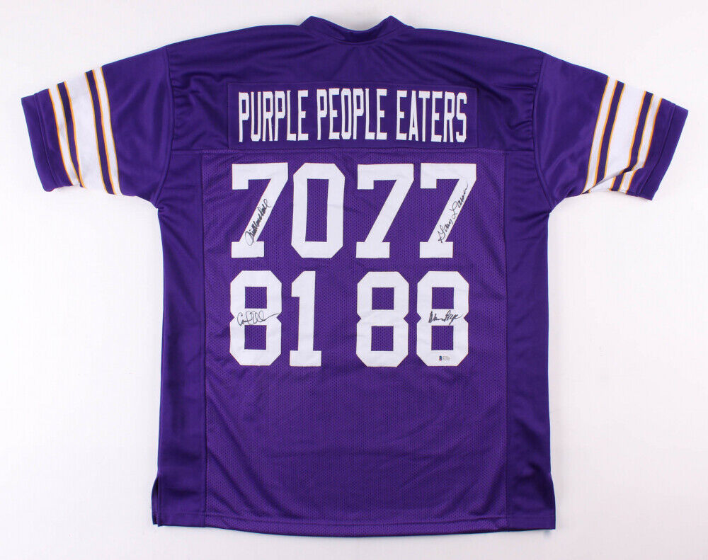 Custom on-field style jersey. Everything is sewn on, size XL. Jersey has been hand-signed in black felt-tip pen by Alan Page (HOF), Carl Eller (HOF), Jim Marshall and Gary Larsen. The lot / autograph(s) includes an official Beckett Authentication Services serially numbered hologram and QR Code card for authenticity purposes. The signing of this item was witnessed by Beckett.Authentication: Beckett Hologram with QR Code Card