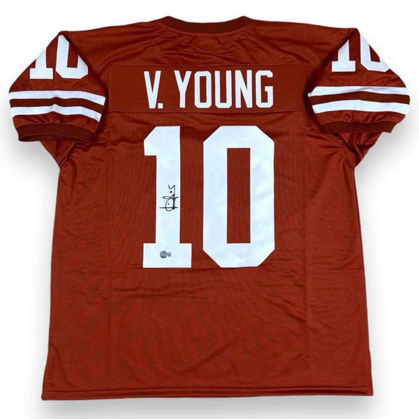 This signed item is brand new without tags or logos. This custom jersey is sewn in a size Large / XL. All the letters and numbers are sewn on! This item will make a great gift or a great addition to any collection at an AFFORDABLE PRICE! ATHLETE: Vince Young ITEM: Custom Sewn Jersey AUTHENTICATION: This item comes with a Beckett Authentication serial #'ed hologram affixed to the item. To ensure authenticity, the hologram can be reviewed online. This process helps to ensure that the product purchased is authentic and eliminates any possibility of duplication or fraud. NOTE: All of our autographed jerseys are custom jerseys, unless otherwise noted. Our custom jerseys are NON-BRANDED, have NO logos, NO tags, NO patches, NO emblems. All letters and numbers are SEWN-ON. The non-branded jerseys are made specifically for the player(s) to sign, for collectible purposes.