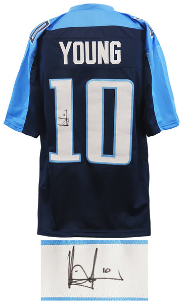 Vince Young signed blue custom football jersey. Item comes with a Schwartz Sports Memorabilia tamper-proof numbered hologram and Certificate of Authenticity which can be verified online. Jersey is size XL.