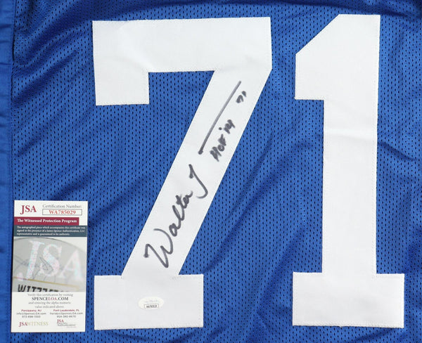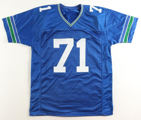 Custom on-field style jersey. Everything is sewn on, size XL. Hand-signed in black felt tip pen by Walter JonesJones' career highlights have been custom stitched onto the back of the jersey below the reverse numbers.(Seattle Seahawks, HOF). The autograph includes an official James Spence Authentication (JSA) hologram and matching COA for authenticity purposes. The signing of this item was witnessed by JSA.Authentication: JSA COA