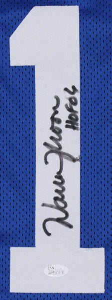 Custom on-field style jersey. Everything is sewn on, size XL. Hand-signed in black felt-tip pen by Warren Moon (HOF). The lot / autograph(s) includes an official James Spence Authentication (JSA) hologram and matching COA for authenticity purposes. The signing of this item was witnessed by JSA.Authentication: JSA COA