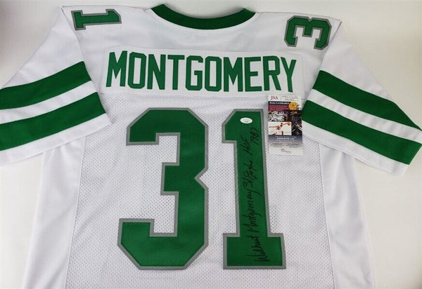 Custom on-field style jersey. Everything is sewn on, size XL. Hand-signed and inscribed in black felt-tip pen by Wilbert Montgomery. The lot / autograph(s) includes an official James Spence Authentication hologram and matching COA for authenticity purposes.Authentication: JSA COA