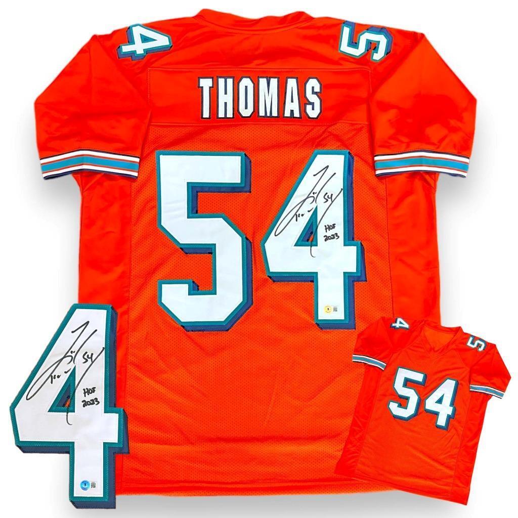 This signed item is brand new without tags or logos. This jersey is a size Large / XL. All letters and numbers are sewn on. This item will make a great gift or a great addition to any collection at an AFFORDABLE PRICE! ATHLETE: Zach Thomas with HOF 2023 inscription! ITEM: Custom Jersey AUTHENTICATION: This item comes with a Beckett serial #'ed hologram affixed to the item. To ensure authenticity, the hologram can be reviewed online. This process helps to ensure that the product purchased is authentic and eliminates any possibility of duplication or fraud. NOTE: All of our autographed jerseys are custom jerseys, unless otherwise noted. Our custom jerseys are NON-BRANDED, have NO logos, NO tags, NO patches, NO emblems. Pro tackle twill letters and numbers. The non-branded jerseys are made specifically for the player(s) to sign, for collectible purposes.