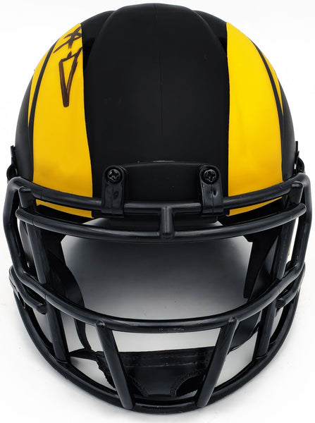 This is a Los Angeles Rams Eclipse Black Speed Mini Helmet that has been hand signed by Aaron Donald. The Eclipse helmets are delicate and may have some marks or scratches on them. This item has been witnessed and certified authentic by Beckett Authentication (BAS) and comes with their tamper-proof witness sticker.