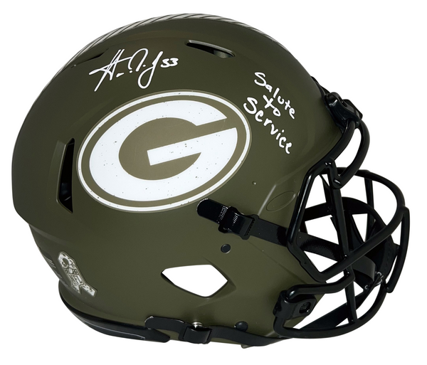 Aaron Jones, star running back for the Green Bay Packers, has hand signed this Packers Riddell Speed Salute to Service full-size authentic helmet at a private signing. He included the inscription "Salute to Service". This helmet is fully padded inside like the ones worn on the field. This item is authenticated by Beckett Authentication Services and was signed in the presence of one of their representatives. Their tamper-evident hologram featuring a QR code and serial number is on the item. The authenticity can be verified online by entering the serial number or scanning the QR code.Item pictured may not be the exact item you will receive. It will be similar quality, and we guarantee your satisfaction.