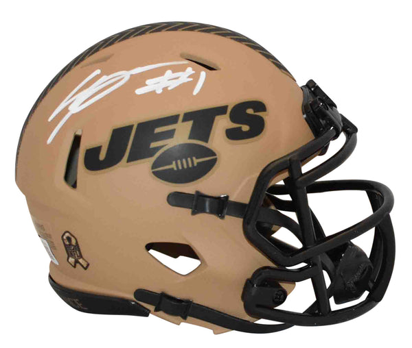Ahmad "Sauce" Gardner, All-Pro cornerback for the New York Jets, has hand signed this Jets Riddell Speed Salute to Service II mini helmet at a private signing. This item is authenticated by Beckett Authentication Services and was signed in the presence of one of their representatives. Their tamper-evident hologram featuring a QR code and serial number is on the item. The authenticity can be verified online by entering the serial number or scanning the QR code.Item pictured may not be the exact item you will receive. It will be similar quality, and we guarantee your satisfaction.