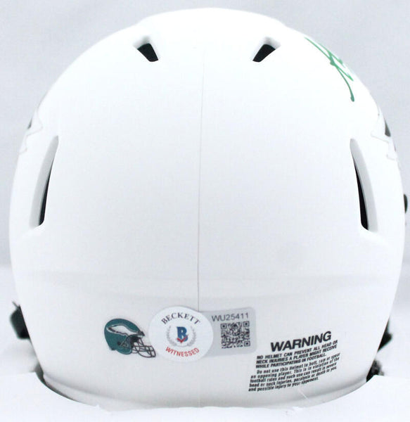 AJ Brown Autographed Philadelphia Eagles Lunar Speed Mini Helmet-Beckett W Hologram *Green This is a hand autograph of AJ Brown of the Philadelphia Eagles on a Riddell Football Lunar Speed Mini Helmet. This item has a Beckett Witness Authentication, which comes with a Beckett numbered hologram and a QR code for verification. You can view this item on the Beckett website and it shows when and where the item was signed. It was signed either at a public autograph appearance or a private signing. This is a stock photo of the item. Although you may not receive this exact item, the item you receive is virtually identical and brand new in great shape.