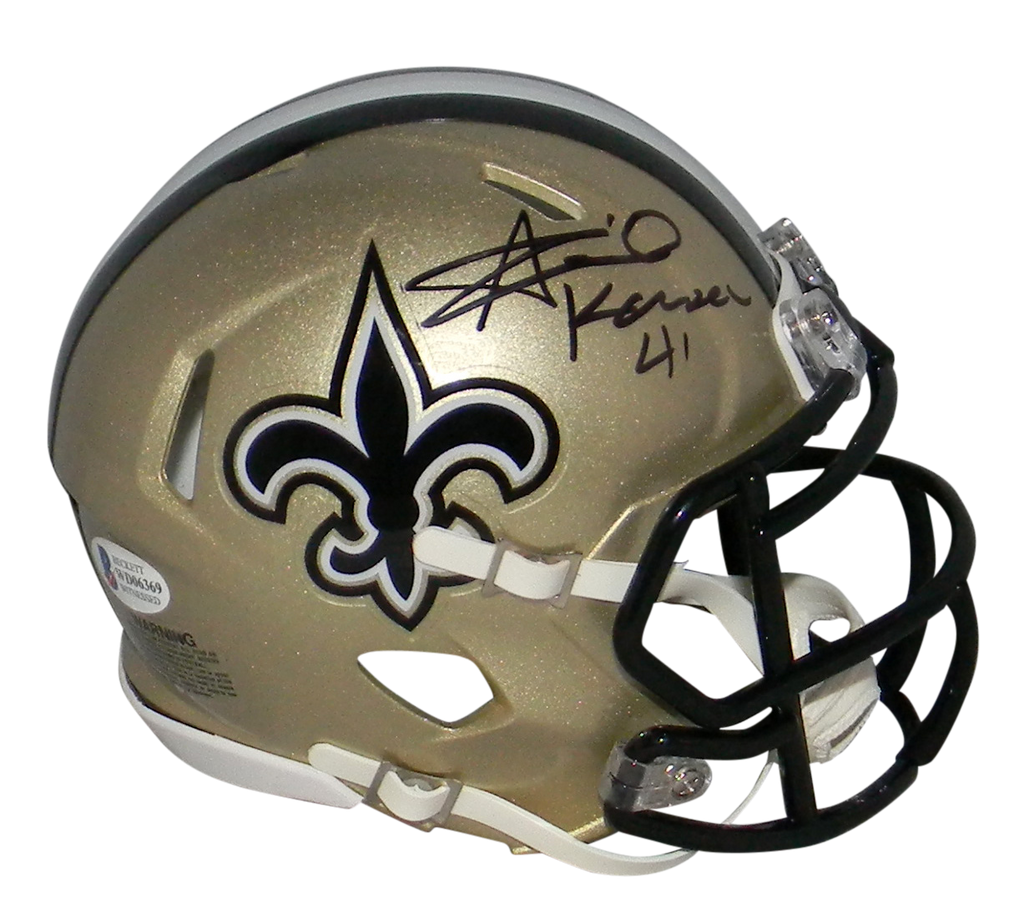 Alvin Kamara, All-Pro running back for the New Orleans Saints, has hand signed this Saints Riddell Speed mini helmet at a private signing. This item comes with a certificate of authenticity (COA) from Beckett Authentication Services and was signed in the presence of one of their representatives. You will receive a serial-numbered COA along with a matching serial-numbered sticker on the helmet. The authenticity can be verified online by entering the serial number.Item pictured may not be the exact item you will receive. It will be similar quality, and we guarantee your satisfaction.