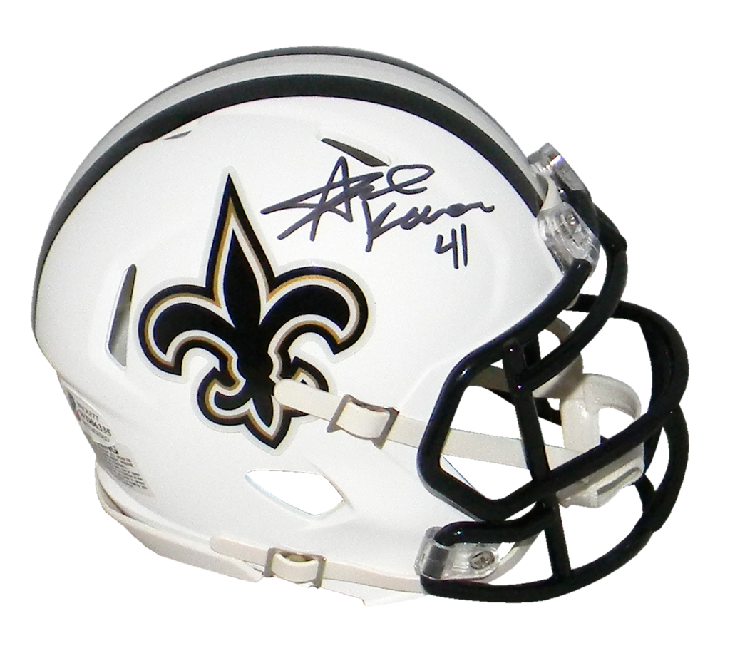 Alvin Kamara, All-Pro running back for the New Orleans Saints, has hand signed this Saints Riddell Speed Flat White mini helmet at a private signing. This item comes with a certificate of authenticity (COA) from Beckett Authentication Services and was signed in the presence of one of their representatives. You will receive a serial-numbered COA along with a matching serial-numbered sticker on the helmet. The authenticity can be verified online by entering the serial number.Item pictured may not be the exact item you will receive. It will be similar quality, and we guarantee your satisfaction.