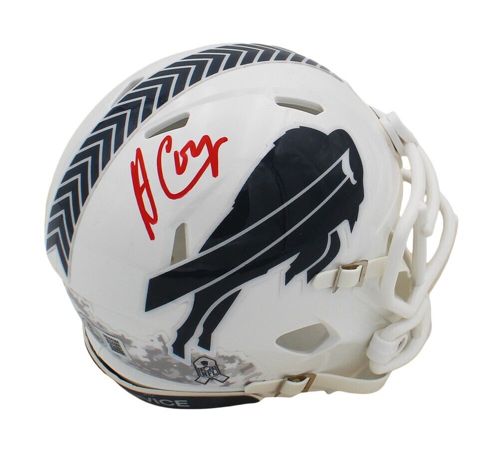 A Buffalo Bills Speed Salute to Service 3 NFL Mini Helmet Hand Signed by Amari Cooper. The item and signature are in excellent condition. Amari is a wide receiver in the NFL. After a successful college career at the University of Alabama, Amari was picked first round 4th overall in the 2015 NFL Draft. He had back to back 1000-yard seasons and is a 5x Pro Bowler. AUTHENTICATION: The item is accompanied by a Beckett Serial Numbered and Databased Hologram