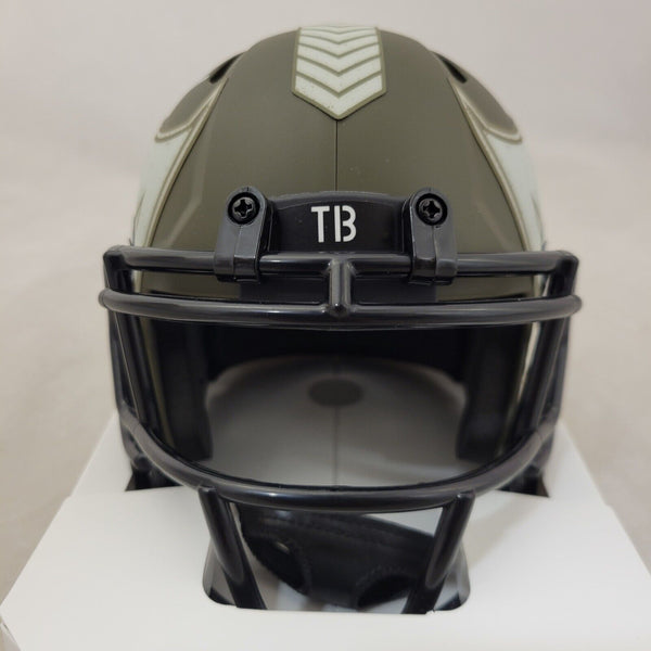 TAMPA BAY AUTOGRAPHED TAMPA BAY BUCCANEERS SALUTE TO SERVICE (STS) SPEED MINI HELMET WITH BECKETT QR COATHIS MEANS THE HELMET WAS SIGNED WITH A BECKETT REPRESENTATIVE PRESENT SO YOU CAN BE 100% CERTAIN ITS THE REAL THING.