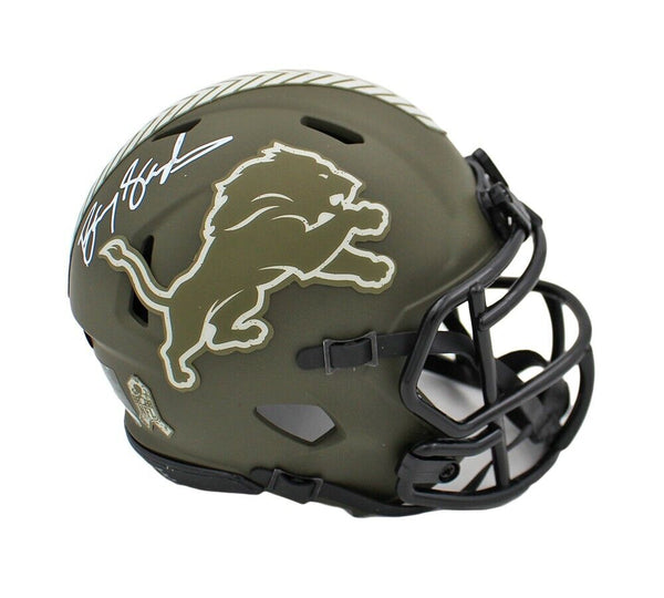 A Detroit Lions Speed Salute to Service NFL Mini Helmet hand signed by Barry Sanders. The item and signature are in excellent condition. Barry is a 10x Pro Bowler, 10x All-Pro, 4x Rushing Champion, and NFL MVP. AUTHENTICATION: The item is accompanied by a Schwartz Sports Certificate of Authenticity - Schwartz Sports Serial Numbered & Databased Hologram and a PSA Certificate of Authenticity - PSA Serial Numbered and Databased Hologram