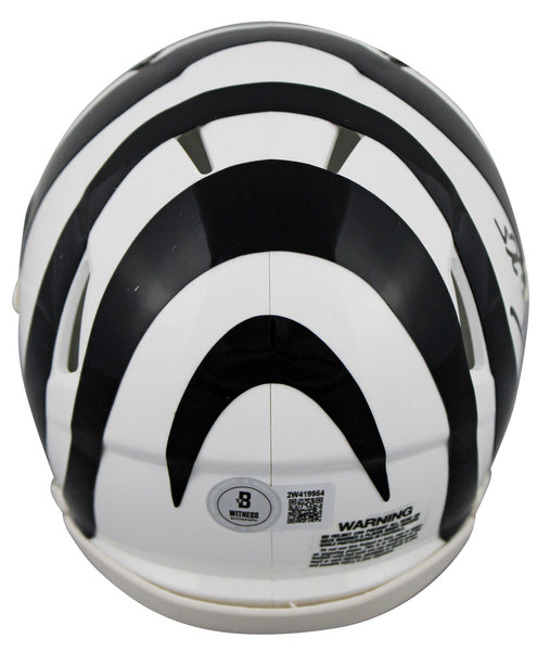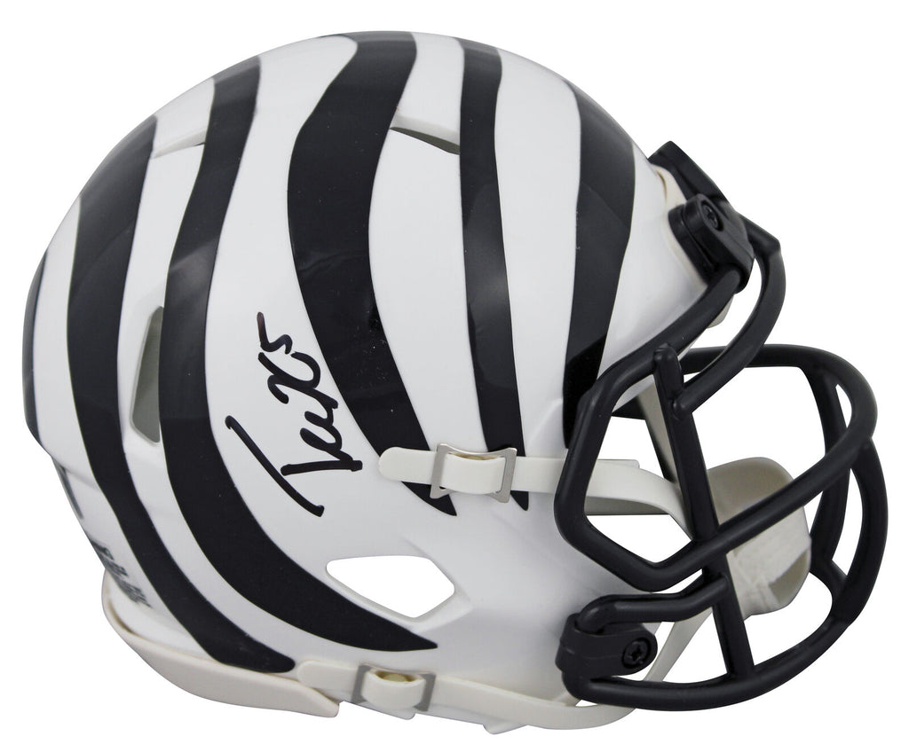 This Autographed 2022 On-Field Alternate Speed Mini Helmet has been Personally Signed by Tee Higgins of the Cincinnati Bengals. This item is 100% Authentic to include a hologram by Beckett Authentication Services. This item will come with an affixed Beckett Authentication Services (BAS) authentication sticker, which includes a scannable QR code to verify authenticity. Please note that Beckett no longer provides serial-numbered COA cards, and the attached BAS sticker will serve as the complete authentication for this item. This is a BAS Witnessed Protection Program item which means a Beckett Authentication Service representative was present when this item was being signed. We conducted an autograph signing with Tee Higgins where multiples of the same item were signed. While the photographs are representative of this item, the size, placement and strength of the signature may vary. Each item is hand signed, therefore, each autograph is unique. This item can be verified through BAS Witnessed.