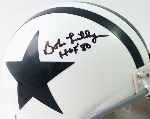 Bob Lilly Autographed Dallas Cowboys 60-63 TB Mini Helmet w/HOF - Beckett W Auth *Black This is a hand autograph of Bob Lilly of the Dallas Cowboys on a Riddell Football 60-63 TB Mini Helmet and is inscribed with HOF 80. This item has a Beckett Witnessed Authentication, which comes with a numbered and a matching Beckett Certificate of Authenticity. You can view this item on the Beckett Authentication website, it shows when and where the item was signed. It was signed either at a public autograph appearance or a private signing. This is a stock photo of the item. Although you may not receive this exact item, the item you receive is virtually identical and brand new in great shape.