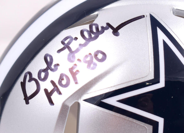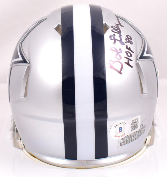 Bob Lilly Autographed Dallas Cowboys Speed Mini Helmet w/HOF-Beckett W Hologram *Black This is a hand autograph of Bob Lilly of the Dallas Cowboys on a Riddell Football Speed Mini Helmet and is inscribed with HOF. This item has a Beckett Witnessed Authentication, which comes with a numbered hologram and a QR code for verification. You can view this item on the Beckett Authentication website, it shows when and where the item was signed. It was signed either at a public autograph appearance or a private signing. This is a stock photo of the item. Although you may not receive this exact item, the item you receive is virtually identical and brand new in great shape.