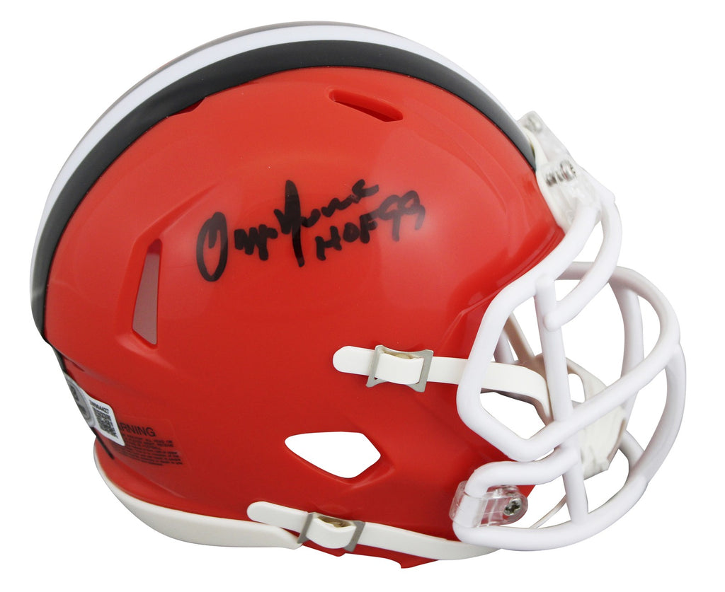This Autographed 2024 Speed Mini Helmet with the inscription of "HOF 99" has been Personally Signed by Ozzie Newsome of the Cleveland Browns. This item is 100% Authentic to include a hologram by Beckett Authentication Services. This item will come with an affixed Beckett Authentication Services (BAS) authentication sticker, which includes a scannable QR code to verify authenticity. Please note that Beckett no longer provides serial-numbered COA cards, and the attached BAS sticker will serve as the complete authentication for this item. This is a BAS Witnessed Protection Program item which means a Beckett Authentication Service representative was present when this item was being signed. We conducted an autograph signing with Ozzie Newsome where multiples of the same item were signed. While the photographs are representative of this item, the size, placement and strength of the signature may vary. Each item is hand signed, therefore, each autograph is unique. This item can be verified through BAS Witnessed.